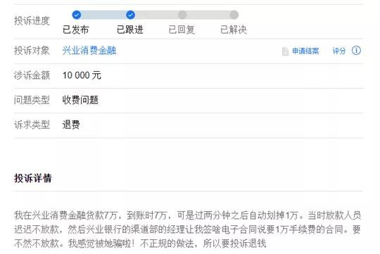 作為銀行系持牌消費金融機構,除了利率踩紅線外,興業消金還被投訴在發放貸款時收取大額砍頭息。2020年4月28日,某借款人在聚投訴發文稱,他在興業消金借款7萬,到賬7萬,但兩分鐘後自動劃款1萬。借款人稱,一開始放款人員遲遲不放款,隨後興業銀行渠道部經理讓其簽署電子合同,要收取1萬元的手續費,要不然不放款。借款人認為這不是正規做法,感覺被欺騙。