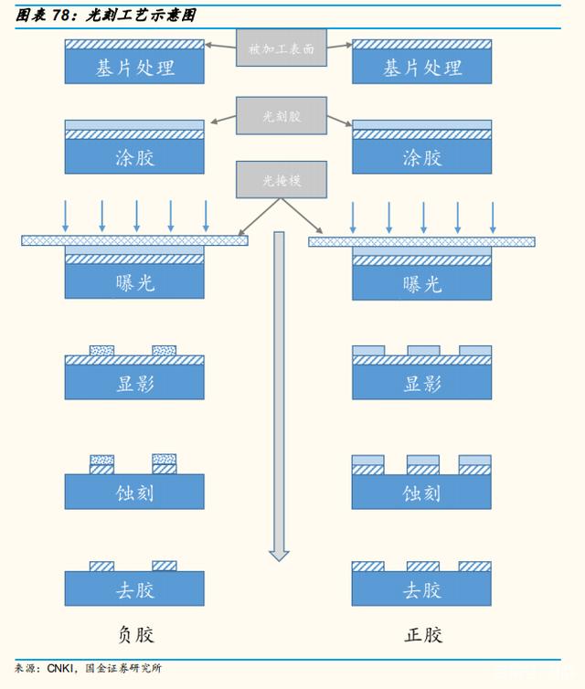 二:要想完成光刻,必須有光刻膠,必須事先在硅片上塗上光刻膠。那什麼是光刻膠?光刻原理具體是怎樣的?光刻膠又稱光致抗蝕劑,是指通過紫外光、電子束、離子束等照射或輻射,其溶解度發生變化的耐蝕刻薄膜材料。在光刻的時候,首先在硅片上塗上光刻膠,光刻機的激光透過光罩照在塗有光刻膠的硅片上,於是光刻膠的溶解度就會發生變化。也就是説,被光照到的地方和沒被光照到的地方,溶解度不同。接着,再用化學品將多餘的部分溶解清洗掉,於是就形成了與光罩完全對應的電路圖,後面通過蝕刻將所需要的圖形加工到硅片上,於是硅片上的電路圖就出來了。