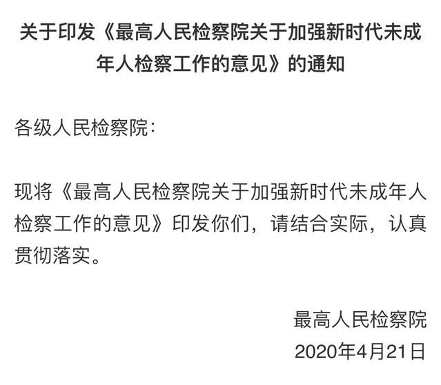 中國青年報客户端北京4月30日電(記者 韓颺)最高檢今天發佈《最高人民檢察院關於加強新時代未成年人檢察工作的意見》(以下簡稱《意見》),旨在加強新時代未成年人檢察工作提出指導意見。