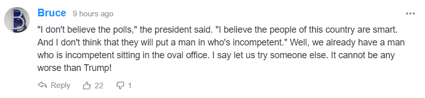 有觀網的朋友在留言中反映為啥沒有支持特朗普的言論。筆者解釋一下,我在國內常看的美國新聞網站是MSN、Yahoo。其中MSN比較偏左,也就是偏民主黨,但是新聞沒有網友留言功能。Yahoo很難説是偏民主黨還是共和黨,不過這次這條新聞中的高贊留言,確實是幾乎一面倒的都是希望川建國連任失敗的。