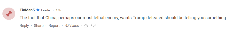 “事實上,作為我們可能最致命的敵人,中國希望特朗普敗選,這很説明問題。”(筆者:朋友,你是有多不瞭解自己的假想敵?)