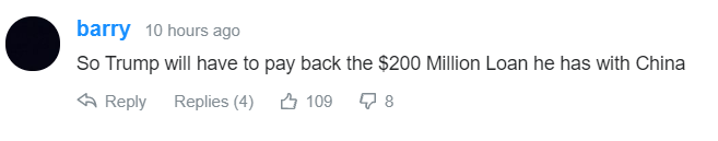 “那樣特朗普就得把他欠的兩億美元還給中國了。”