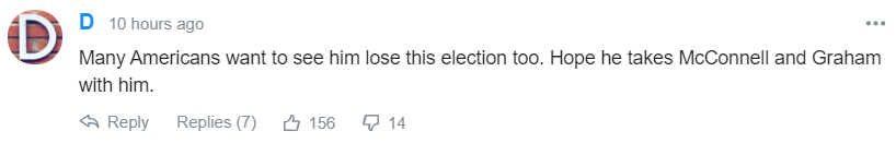 “很多美國人也希望他失去連任機會。希望他把麥康奈爾和格拉漢姆一起帶走。”(筆者:那兩個人是共和黨的議員頭頭。這條獲贊很多。)
