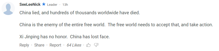 “中國説謊,世界上死了數十萬的人。中國是整個自由世界的敵人。自由世界必須做出回應。中國的領導人沒有榮譽感。中國丟臉。”(筆者:哥們,且不説你這充滿偏見的厥詞有多少真實性,我大學四級沒過的時候寫的英語句子好像比你用的都複雜。你這留言瞄準的是美國學齡前兒童麼?)