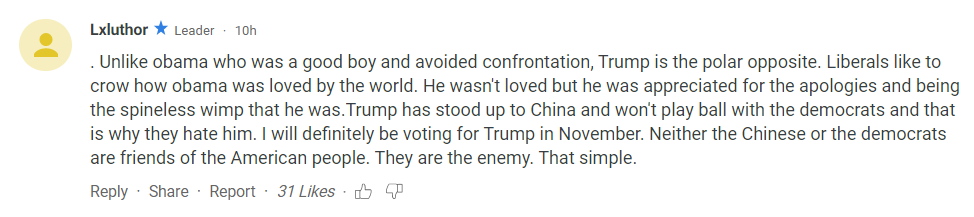 “特朗普和奧巴馬好孩子的形象完全相反。自由派喜歡吹噓奧巴馬如何被全世界喜歡。世界並不喜歡他,而是喜歡他沒骨氣只會道歉的樣子。特朗普勇敢對抗了中國而且不與民主黨同流合污,這是他們恨他的原因。我今年十一月絕對會投票給特朗普。中國人和民主黨從來就不是美國人的朋友。他們是敵人。很簡單。”(筆者:我還能説啥,且不説中國,你直接把差不多一半的美國政治勢力標記為自己國家的敵人了。反正MAGA就是了!)