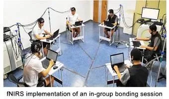 圖1 高羣體凝聚力條件下,近紅外多腦同步記錄-實時互動實驗示意圖。