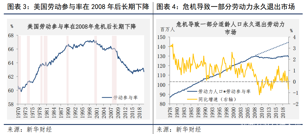 2008年全球金融危機的影響不僅侷限於造成衰退程度之深,更在於其產生的“後遺症”延續時間之久。從居民部門角度看,首先,危機後美國一部分適齡人口工作意願下降,並永久退出勞動力市場(圖表3,圖表4)。從以往規律看,經濟衰退後短期內勞動參與率下降是常見現象,其原因比較複雜,可能是由於對找工作失去信心、對工資制度不滿,或是因為社會保障制度發生變化等。2008年後勞動參與率的下降幅度與歷次衰退比更為突出,如果粗略地取危機前的勞動參與率階段性高位,即2006年四季度的66.4%計算,至2015年四季度共有757.1萬適齡(15-64歲)人口退出勞動力市場,至2019年四季度減少至660.2萬(作為參考,2009年7月至2020年2月美國新增非農就業總和約2200萬)。這不僅指向勞動力市場供給下降,也側面反應了部分居民對工作的態度轉變,而勞動參與率只是幫助其量化的一個維度。