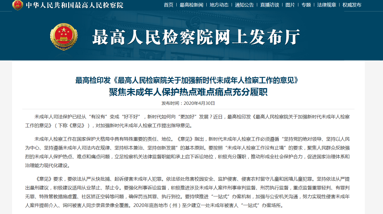 4月30日,最高人民法檢察院發佈《最高人民檢察院關於加強新時代未成年人檢察工作的意見》。《意見》明確,從嚴懲治侵害未成年人犯罪,2020年底各地市(州)至少建立一處未成年被害人“一站式”辦案場所。