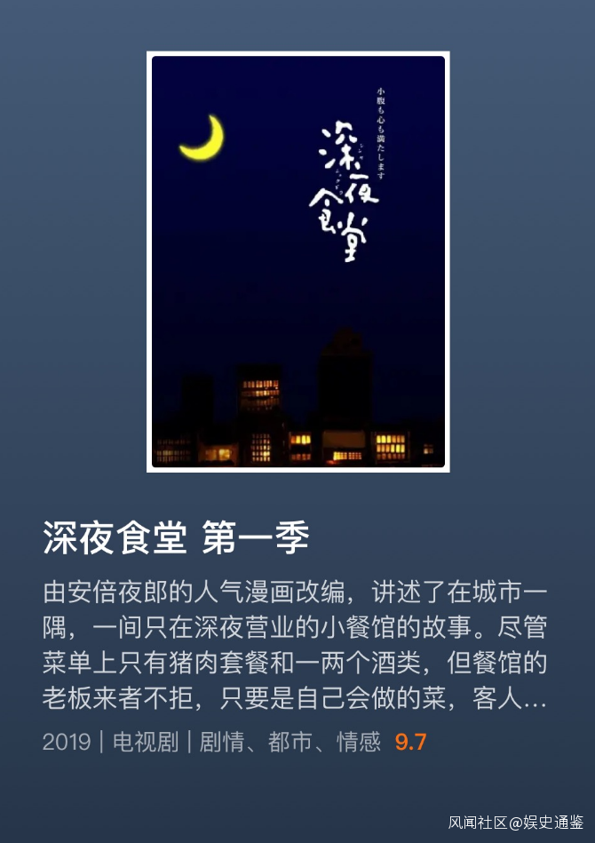 還有人喜歡主打治癒和陪伴的温情美食劇《深夜食堂》,通過一道道食物和人的情感建立鏈接,讓人在滿足口腹之慾的同時,內心也得到些許安慰。
