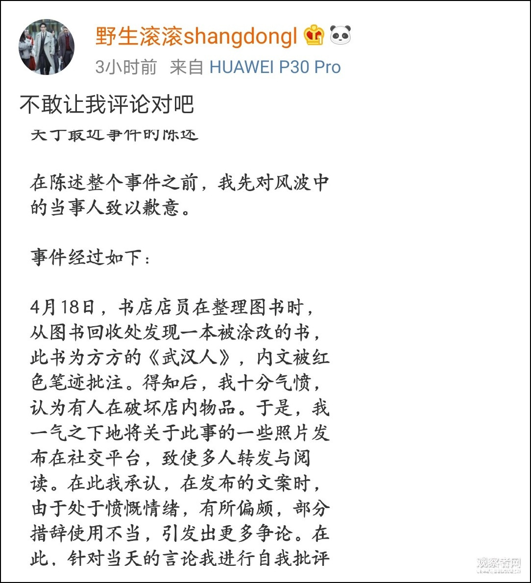 4月29日,書店老闆劉二囍在社交媒體上稱,他已經向當事人@野生滾滾shangdongl 道歉,不過這一説法卻遭到後者的否認。