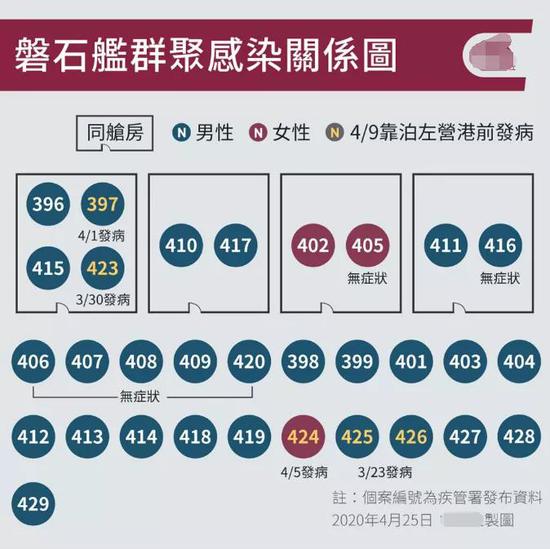 ▲注意左上角這位代號叫396的病例,他在航行期間就出現頭痛症狀了,但因為艦上當時判斷這是“暈船症狀”,所以沒有第一時間向上通報