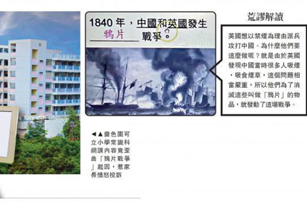 據《大公報》報道,一名香港家長陳女士(化名)透露,日前與孩子一起觀看小學二年級常識課的網課視頻,發現授課教師講到鴉片戰爭的起因時,竟然妄稱“英國為消滅鴉片才攻打中國”。這名教師説,“英國想以禁煙為理由派兵攻打中國。為什麼他們要這麼做呢?就是由於英國發現中國當時很多人吸煙,吸食煙草,這個問題相當嚴重,所以他們為了消滅這些叫做鴉片的物品,就發動了這場戰爭。”