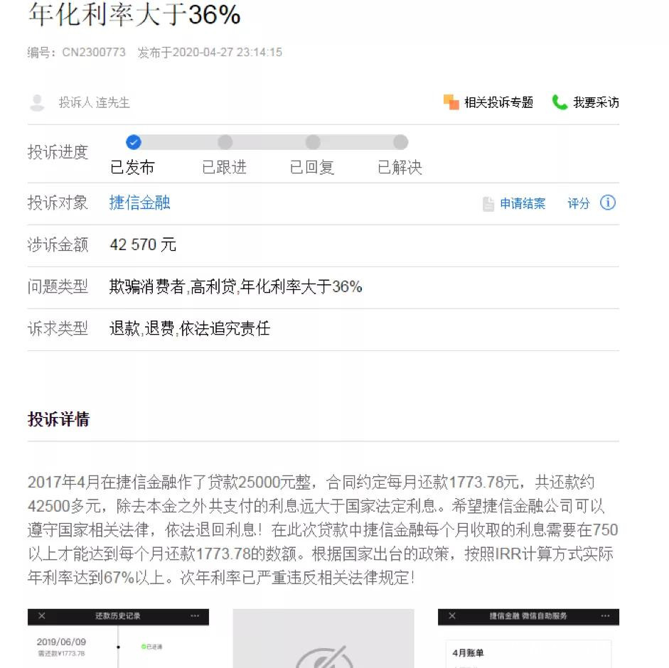 當前,21CN聚投訴顯示,捷信消費金融涉及高利貸、暴力催收等投訴量36327件,解決率僅33.15%。其中,連先生在21CN聚投訴中表示,“捷信金融年化利率大於36%。”
