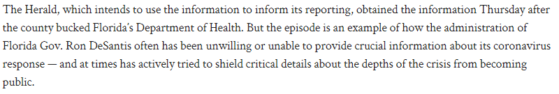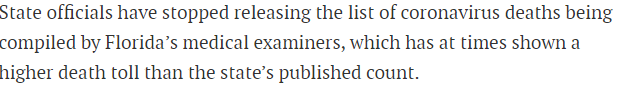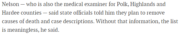 佛州醫學檢查委員會主席斯蒂芬·納爾遜(Stephen Nelson)向坦帕灣時報表示,當地衞生部門同時要求刪除諸如死亡原因、病例詳情等對疫情防控至關重要的信息——納爾遜説,沒有這些信息,疫情統計數據將毫無意義。