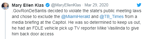 據《國會山報》3月28日報道,擔任《邁阿密先驅報》和《坦帕灣時報》分局主席的瑪麗·艾倫·克拉斯(Mary Ellen Klas)被拒絕進入佛羅里達州議會大廈參與新聞發佈會。