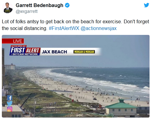 CNN在19日報道中也稱,傑克遜維爾海灘(Jacksonville Beach)開放之時,人們歡呼雀躍,並且淹沒了它(Crowds cheered and flooded the beach)。