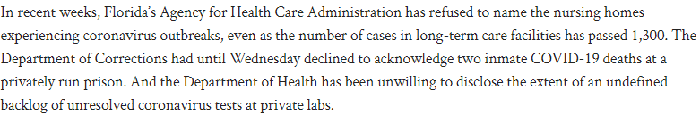 早在當地時間17日,新聞網站“新聞在線”稱,佛州衞生保健管理局(Florida’s Health Care Administration)有所選擇地隱瞞了療養院、監獄的實際情況,以及私營檢測機構中的部分新冠病毒數據。