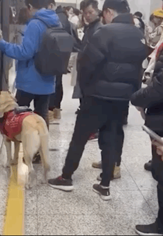 當時,地鐵站熙熙攘攘,一位盲人正牽着導盲犬等候列車。