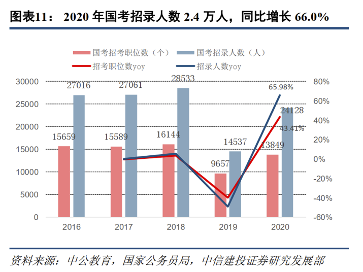 數據顯示,2020年我國高校畢業生數量將達到874萬,達到歷史最高值。對此,評級機構中信建投認為,疫情的爆發給大學生就業帶來巨大不確定性,中小企業的市場化就業機會預計會減少。而2020年國考公務員招錄人數同增66%,預計各省省考公務員、事業單位及教師的招錄名額亦將大幅增長。應屆畢業生將回流到體制內招錄考試中,帶來行業參培率和參培人數大幅提升。
