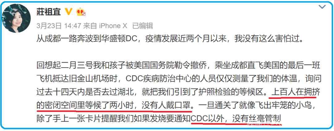 她説:“二月三號我和孩子被美國國務院勒令撤僑,乘坐成都直飛美國的最後一班飛機抵達舊金山機場時,CDC疾病防治中心的人員僅僅測量了我們的體温,詢問過去十四天內是否去過湖北,就把我們引到了護照檢驗的等候區。**上百人在擁擠的密閉空間裏等候了兩小時,沒有人戴口罩。一旦通關了就像飛出牢籠的小鳥,**除了手上一張卡片提醒我們如果發燒要通知CDC以外,沒有絲毫管制!”