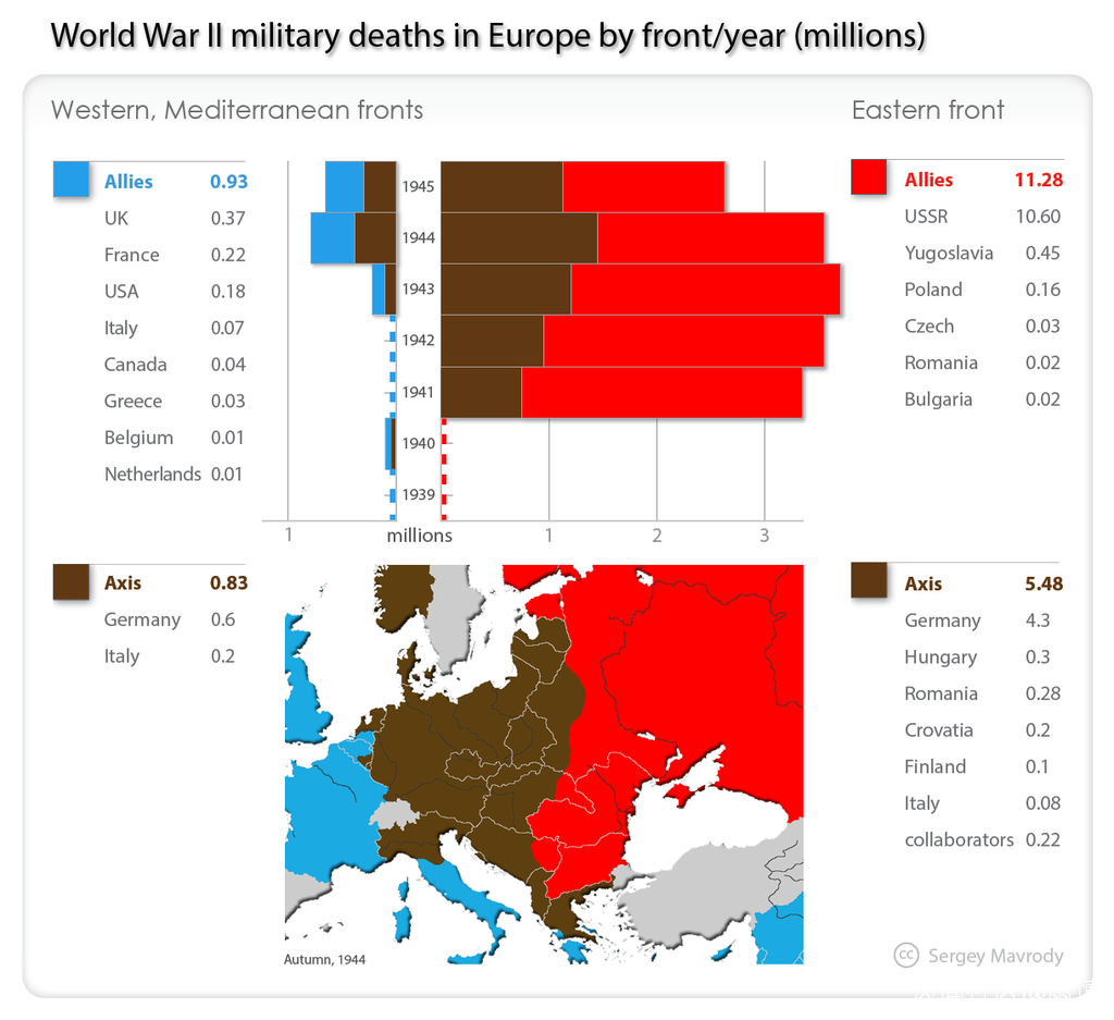 如果看看戰爭的人員傷亡,那麼蘇聯顯然遭受了最大的損失。託尼·賈特(Tony Judt)戰後的估計表明,在第二次世界大戰中,有860萬蘇聯士兵死亡,超過1600萬平民死亡。在戰爭的所有戰場上,美國損失了41.85萬軍人和平民,這仍然是一個驚人的數字,但規模不及蘇聯的損失。當然,有可能在不損失很多生命的情況下為戰爭做出重大貢獻,因此傷亡數字不一定是衡量各國相對貢獻的好方法。但是值得反思的是蘇聯人民作出了多大的犧牲。