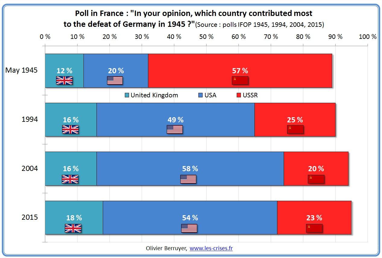 1945年,大多數法國人認為,蘇聯應該從納粹德國在第二次世界大戰中的失敗得到最大的讚譽,儘管相對於美國和英國,蘇維埃在法國的解放中沒有發揮太大作用。然而,到1995年和2004年,法國人改變了主意,並稱讚美國是歐洲勝利的最大貢獻者(以下數據來源於法國輿論研究所Ifop):