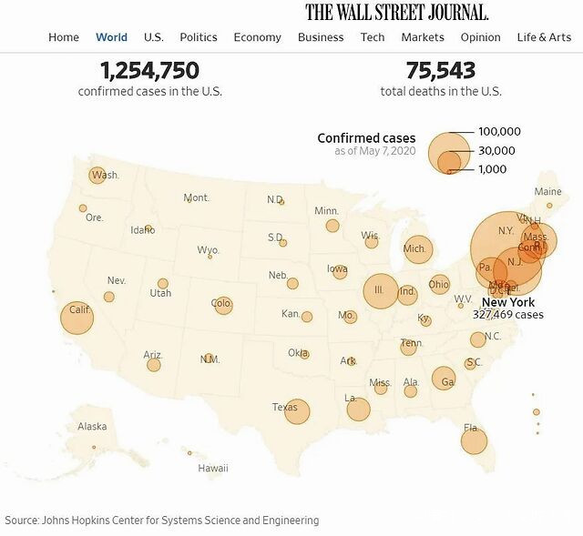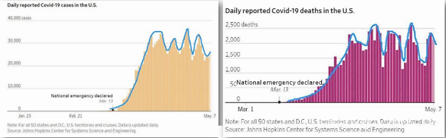 每日新冠死亡數字統計(右)來自Johns Hopkins大學和WSJ