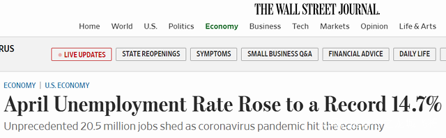今天,美國4月份的失業率數據出來了,給了大家一個下馬威,一個月把過去10年創造的工作機會都給削光了。全美14.7%的失業率,2050萬人失去工作收入。