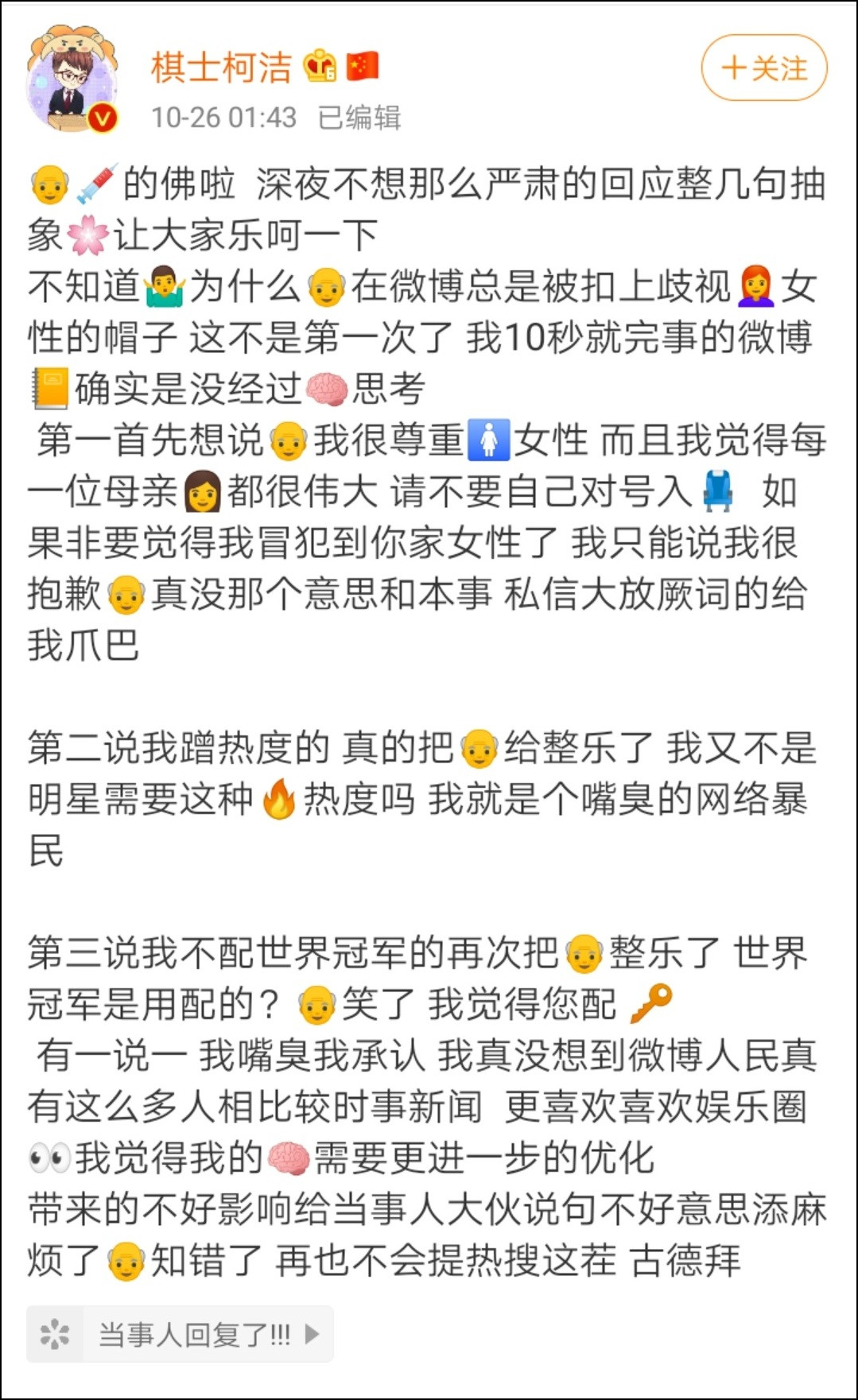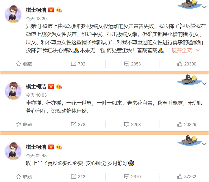 柯潔曾經在微博多次公開懟“女權”,引發了不小爭議。