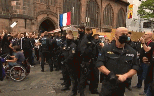 在柏林、慕尼黑等地,抗議者高呼“自由”、“我們是人民”、“我們想要回我們的生活”等口號,並與防暴警察發生衝突。許多人沒有戴口罩,也不遵守保持社交距離規定。柏林警方也曾向抗議民眾噴灑胡椒噴霧,逾30人被捕。
