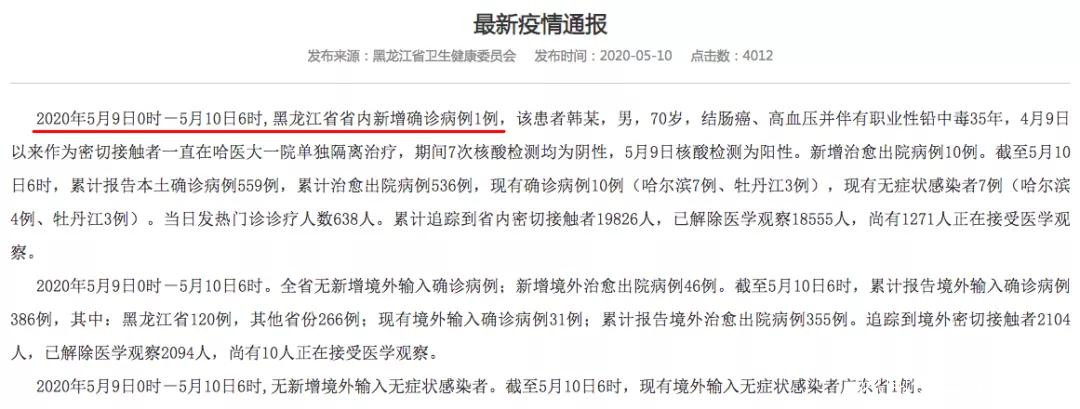 據黑龍江省衞生健康委員會通報,5月9日0時至5月10日6時,黑龍江省省內新增確診病例1例,該患者韓某,男,70歲,結腸癌、高血壓並伴有職業性鉛中毒35年,4月9日以來作為密切接觸者一直在哈醫大一院單獨隔離治療,期間7次核酸檢測均為陰性,5月9日核酸檢測為陽性。