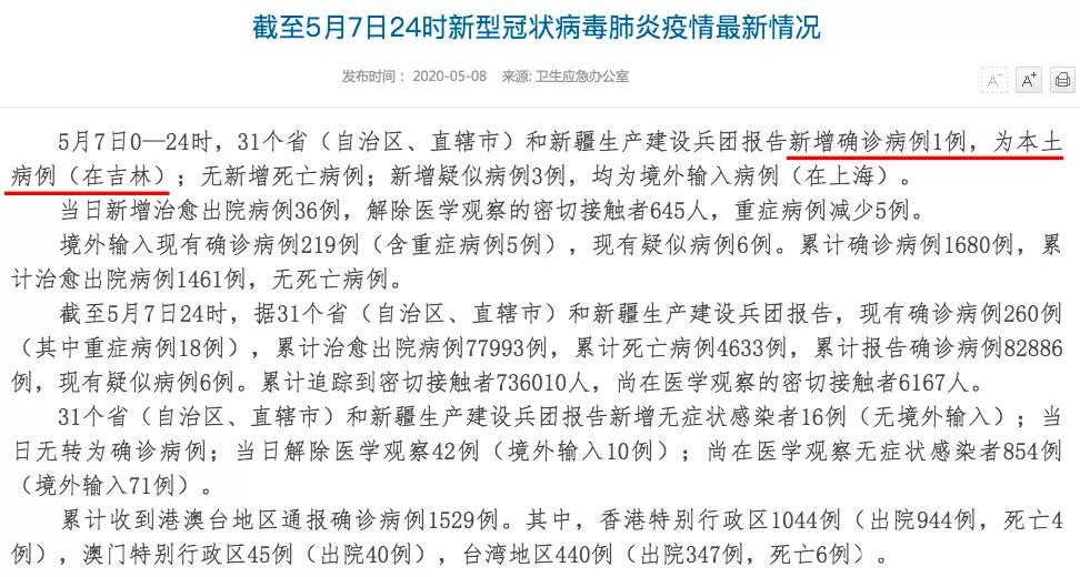 5月7日,吉林省舒蘭市新增1例本地確診病例,打破了吉林省73天無本地新增確診病例的記錄,也是當日全國唯一的新增本土病例。