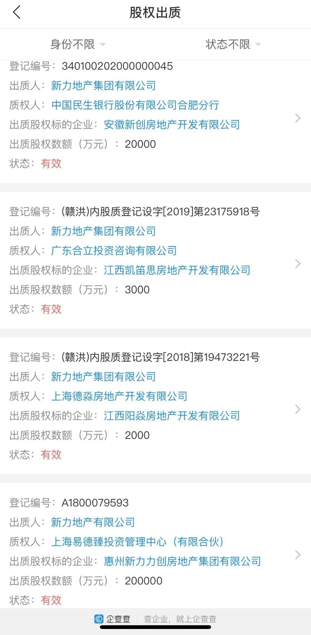 如下圖所示,目前新力地產合計4筆有效股權出質,其中對惠州新力力創房地產集團有限公司出質金額高達20億元。