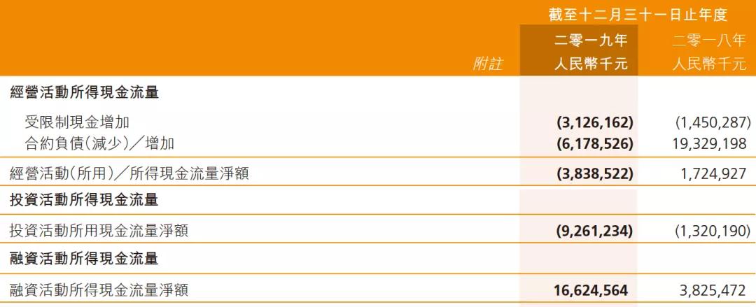 無獨有偶,經營層面更是不容樂觀。 2019年新力地產經營活動產生的現金流淨流出超38億元,比2018年淨流入17億,絕對值少了55億元。