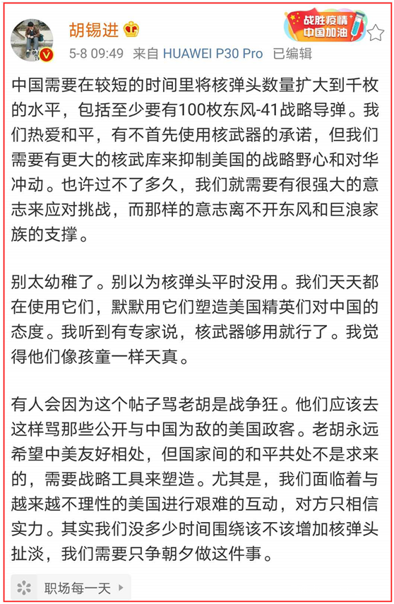 5月8日,《環球時報》總編突發驚人之語,説中國應當在短時間內將核彈頭的數量擴充到千枚以上,包括至少100枚東風41戰略導彈。