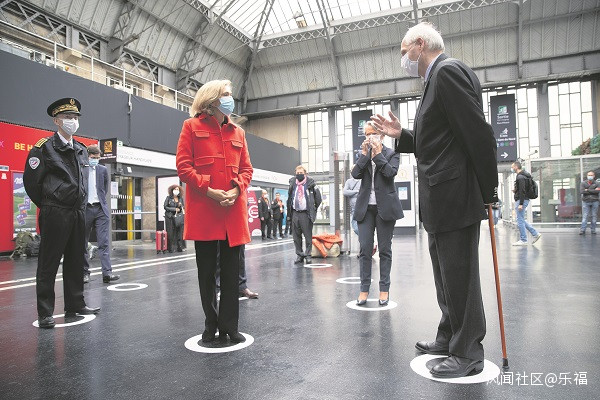 在全法解封前夕,巴黎警察局長拉勒蒙(左)、巴黎大區議會主席佩克雷斯(前排中)、法國交通及能源部長博爾納(後排中)、巴黎大區省長卡多(右)10日在巴黎東站視察解封準備情況,圖為幾人嚴格按照安全距離地面標識相互交談。當天法國政府進一步細化了解封之後各行業的具體安排。(法新社圖)