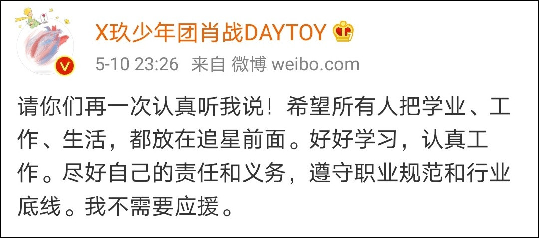 而在稍早時分,肖戰本人同樣親自發微博向粉絲温情喊話,稱自己不需要任何形式的應援。
