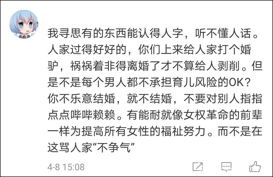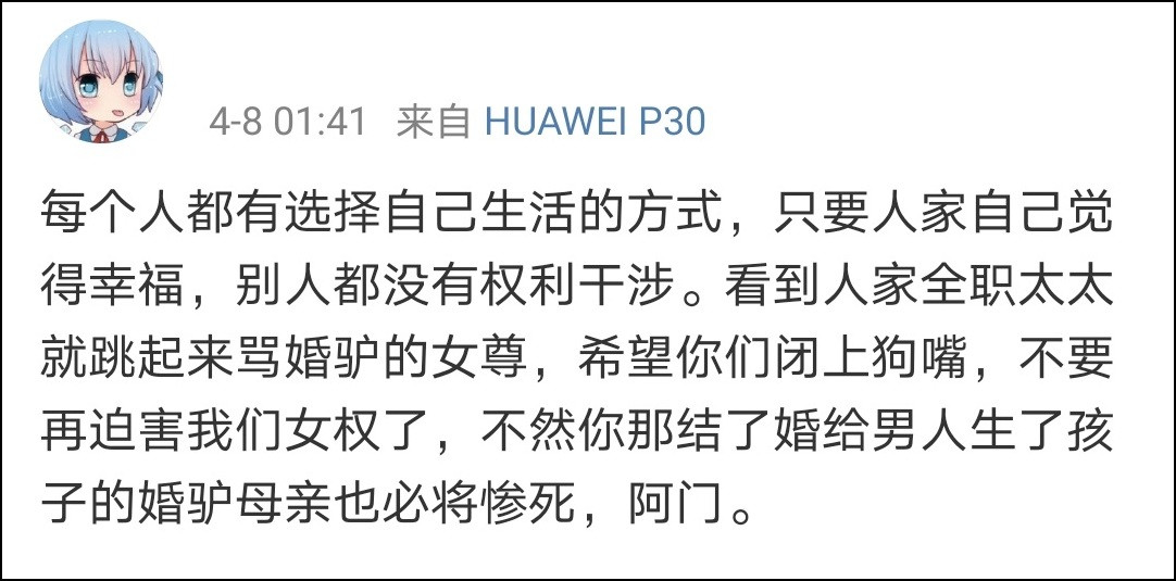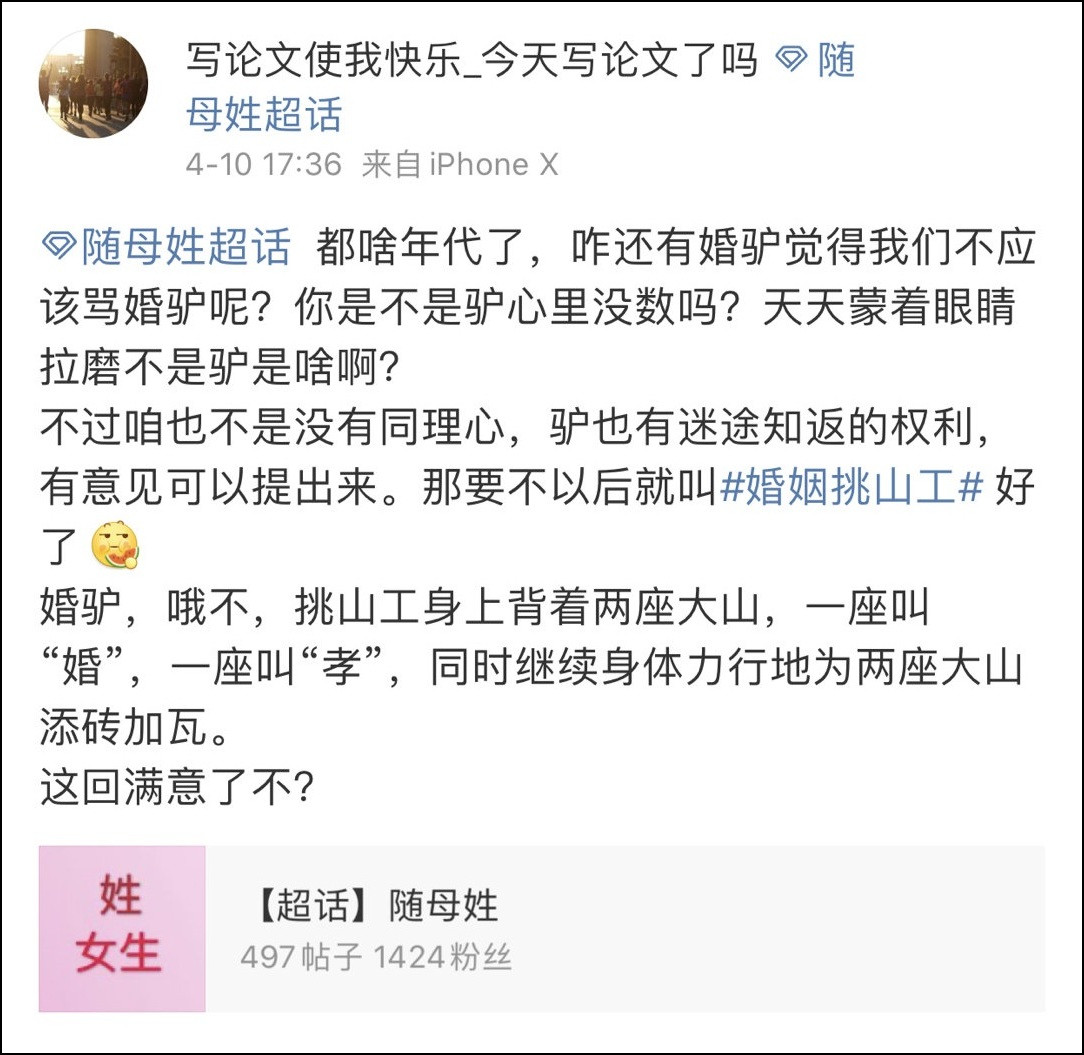 這位網友自詡是一名女權主義者,因為跟丈夫爭奪孩子冠姓權失敗而協議離婚,她和其它的一些女權博主就把在婚姻生活在安於現狀的女性稱之為“婚驢”。