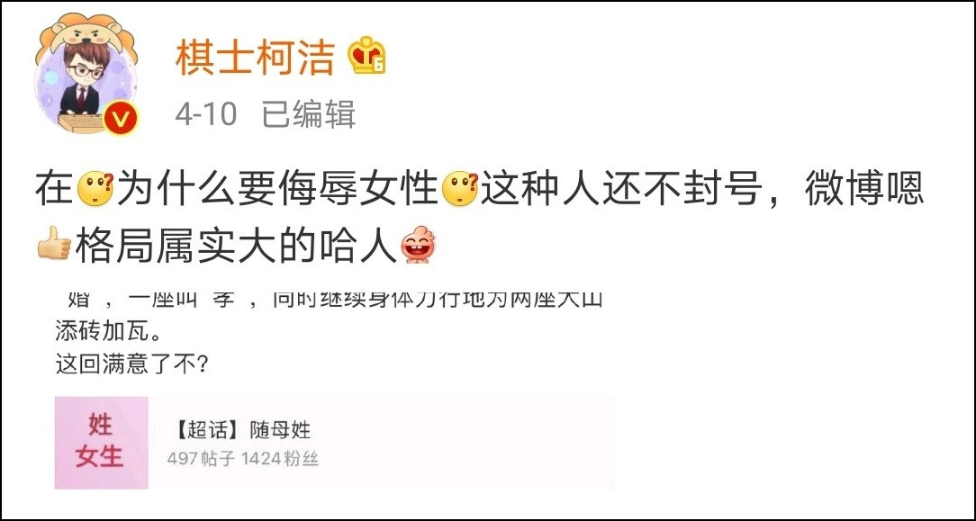 當時,經常就兩性議題發表看法的柯潔對此評論到: