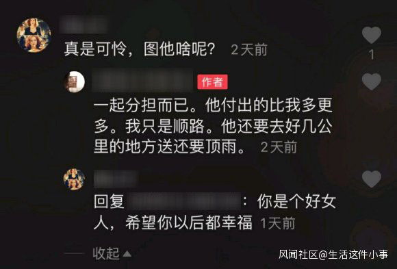 不過,婦女本人卻回覆説:“一起分擔而已。他付出的比我多更多。我只是順路。他還要去好幾裏的地方送還要頂(着)雨。”