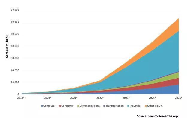 分析機構Semico Research在《RISC-V市場分析:新興市場》的報告中指出,預計到2025年,市場將總共消費624億個RISC-V CPU內核。RISC-V CPU內核從2018年至2025年之間的平均複合年增長率將高達146.2%。其中,5G手機、通訊、工業等細分市場,將為佈局RISC-V的廠商帶來新機。