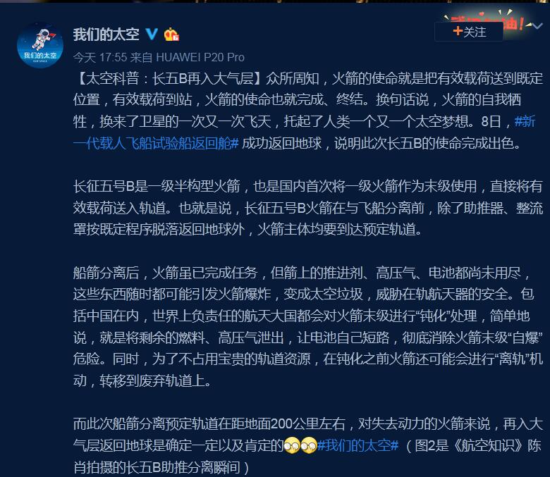 @北斗_玉衡 寫道,“運載火箭,把預定載荷送入太空併成功分離後,末級火箭即成為無控的太空垃圾。如果末級火箭的軌道高度比較低的話,會在太空中運行一段時間後,在地球大氣層中焚燬,地點隨機。沒有人會控制已經無控的太空垃圾使其精確返回。”