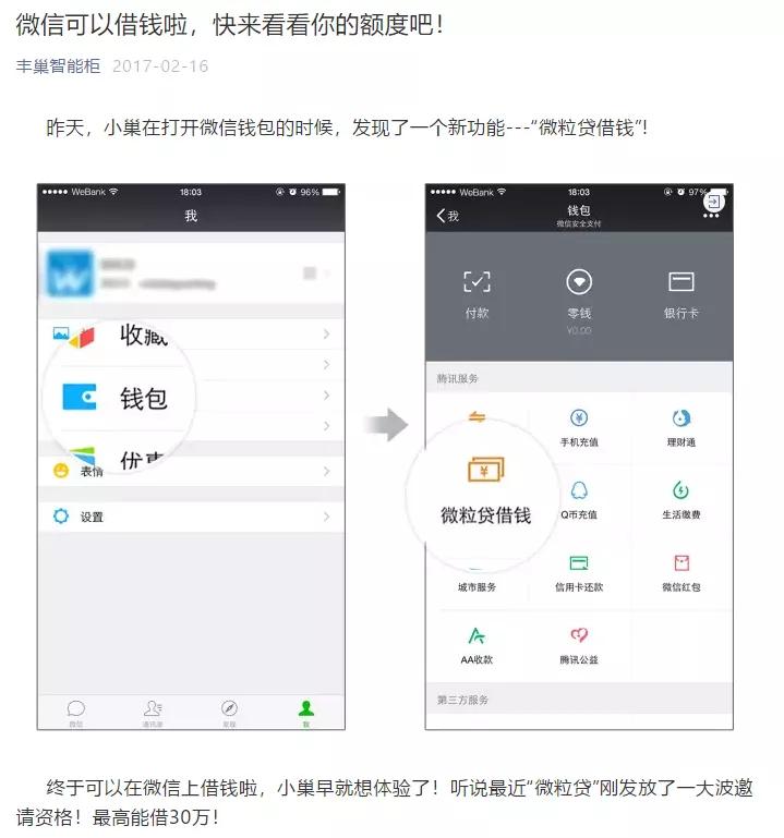 柒財經旗下互聯網金融新聞中心注意到,豐巢微信公眾號曾為P2P以及借貸產品做導流。2017年2月,豐巢微信公眾號發佈一篇名為“微信可以借錢啦,快來看看你的額度吧!”的文章,對微眾銀行小貸產品“微粒貸”進行推廣。