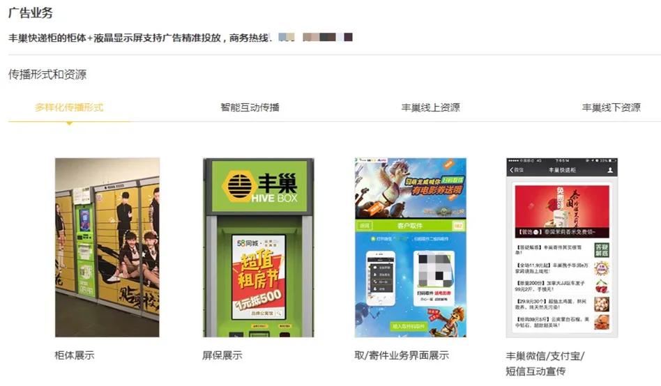 此外,豐巢官網顯示,豐巢快遞櫃的櫃體、液晶顯示屏等均支持廣告精準投放,不僅如此,豐巢還可以通過微信、支付寶以及短信進行互動宣傳。