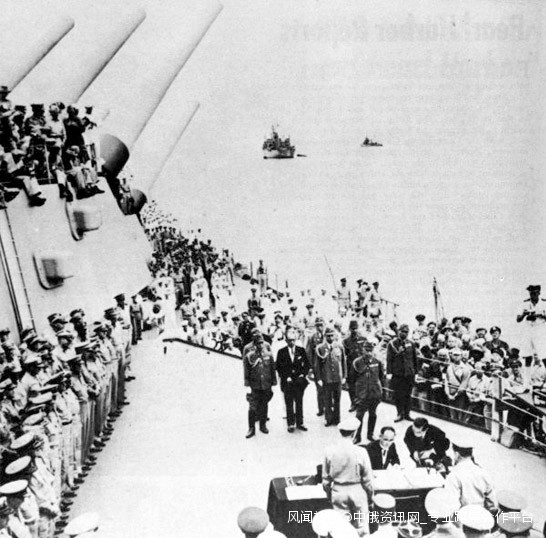 圖為1945年9月2日,日本簽字投降,第二次世界大戰結束。簽字儀式在東京灣美國的“密蘇里”號軍艦上舉行。