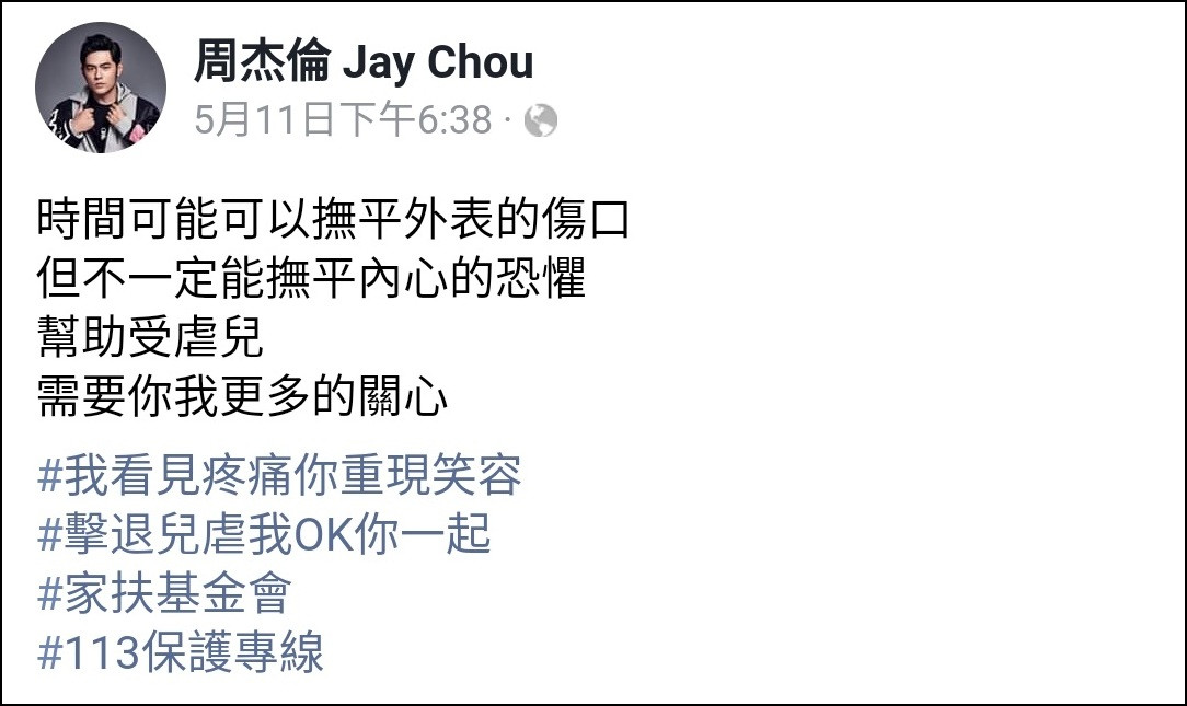 5月11日晚間,周杰倫在臉書上發文為台灣地區遭受家庭暴力的兒童羣體發聲。