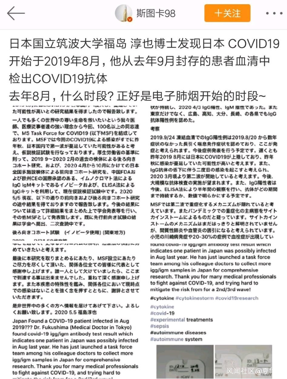 補充:日本筑波大學福島淳也博士在社交媒體聲稱,去年9月封存的肺炎患者血清樣本新冠病毒抗體呈陽性,該患者於8月24日出現不明原因肺炎。