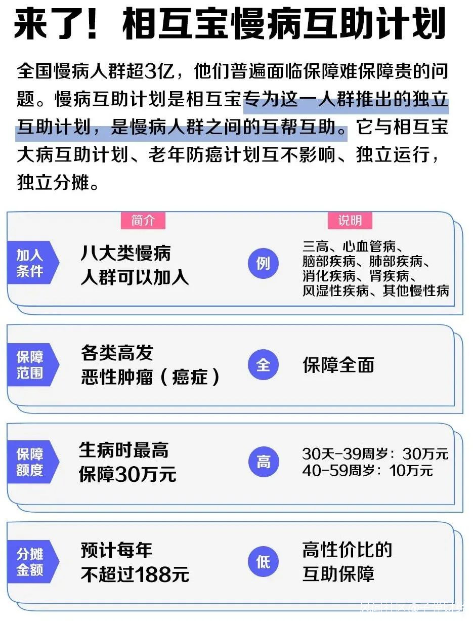因此,基於慢性病人羣保障難、保障貴的痛點,相互寶推出“慢病互助計劃”,讓具備相同特點的人羣互幫互助。