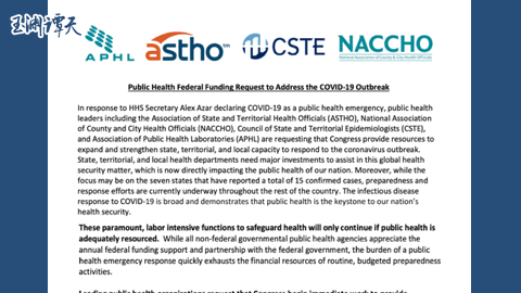 ·2月下旬包括美國公共衞生實驗室協會在內的四家頂級衞生機構,聯合給白宮寫了一封信,提出的第一個要求就是:為CDC提供資金。