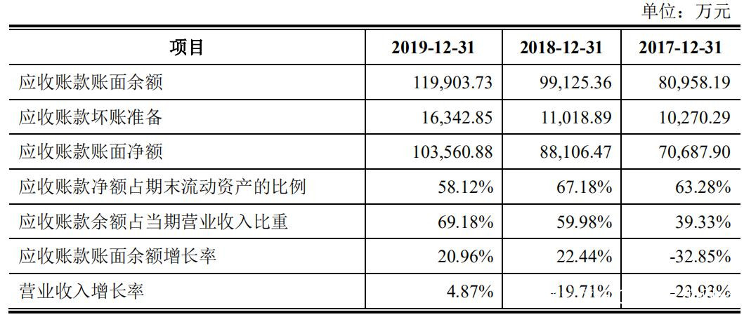 燦星文化應收賬款佔比相對較高,存在應收賬款壞賬的風險。招股書顯示,燦星文化2017-2019年應收賬款淨額分別為7.07億元、8.81億元及10.36億元,佔流動資產的比例分別為63.28%、67.18%及58.12%。